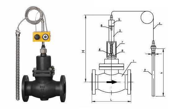 自力式温度控制阀利用感温液体不可压缩的原理,而实现温度自动调节,有加热型和冷却型两种,当被控介质温度升高,控制阀门关闭(加热型);当被控介质温度升高,控制阀门开启(冷却型)。