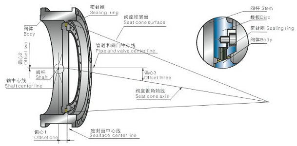典型的三偏心气动蝶阀,除阀杆和阀板有两个偏心外,阀板和阀座的密封面呈斜圆台形(这是所谓三偏心的第三个偏心)。阀门关闭时阀板由于偏心的缘故往前推,阀板和阀座在关闭过程中不产生摩擦,阀板直接压在阀座上,这样就保证了阀门的使用寿命;另外,由于这种阀门的密封圈(不论装在阀座上或阀板上)具有一定的弹性,而且弹性圈内的凸台与弹性圈之间有少量的间隙可使弹性圈稍有位移;在阀门关闭时,受关闭力的作用,弹性体密封圈能自动移至受力最均匀的位置;再加上弹性圈的少量变形,使阀座处的密封圈均匀受力,达到最佳密封状态。