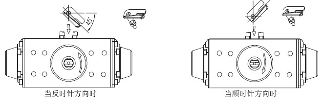 3,把执行机构轴的回转位置对准起始位置,即开度的0%位置。当执行机构是利用弹簧的单作用气缸时,如果不输入气源压力,则气缸轴始终返回到起始点,因此很容易确认。当双作用气缸时,请参照气缸说明书,确认是顺时针旋转还是逆时针旋转,或输入空压时气缸轴的回转方向来判断。