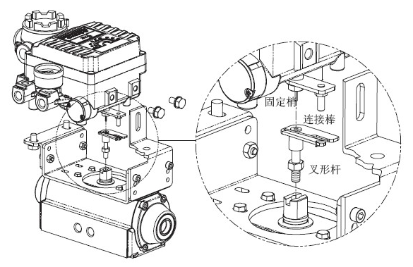 4,设定好叉形杆后,顺时针方向拧紧叉形杆下面的固定螺丝。把阀门定位器安装在支架上。阀门定位器放置在支架上方时,主轴下面的固定梢对准叉形杆上方的中心孔内,同时把主轴反馈杆上的连接棒插入到叉形杆的插槽。这是为了让阀门定位器的主轴和气缸轴的中心一致,如果中心没有对准,那么阀门定位器的主轴上产生负荷力,影响产品的内构成,因此请正确对准中心。