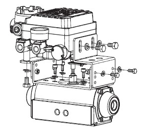 5,用六角螺栓和垫圈固定阀门定位器和支架。固定螺栓时请不要依次完全拧紧螺栓,而要把4个螺栓拧到一定程度后,确认阀门定位器的正确位置后在拧紧4个螺栓。