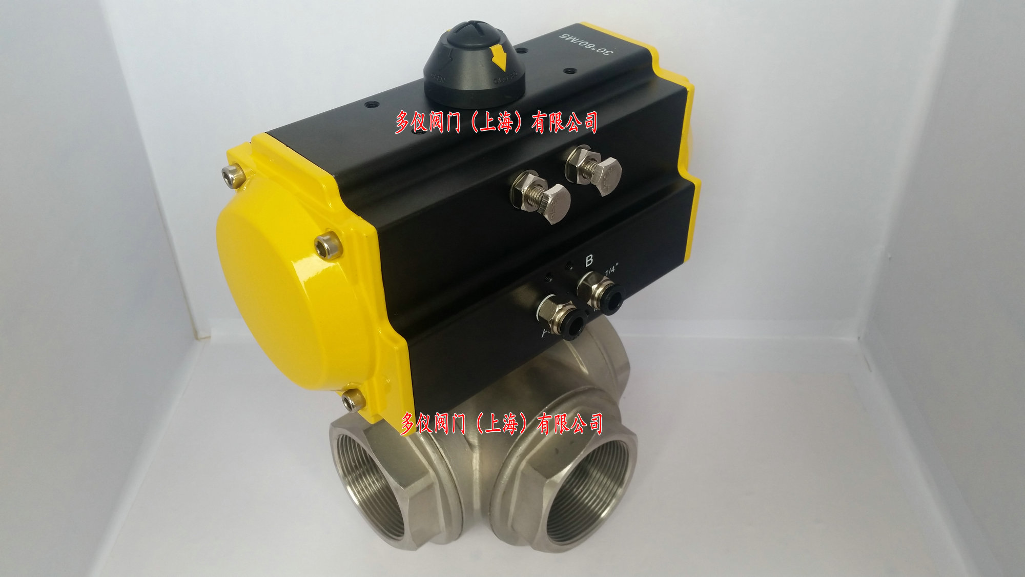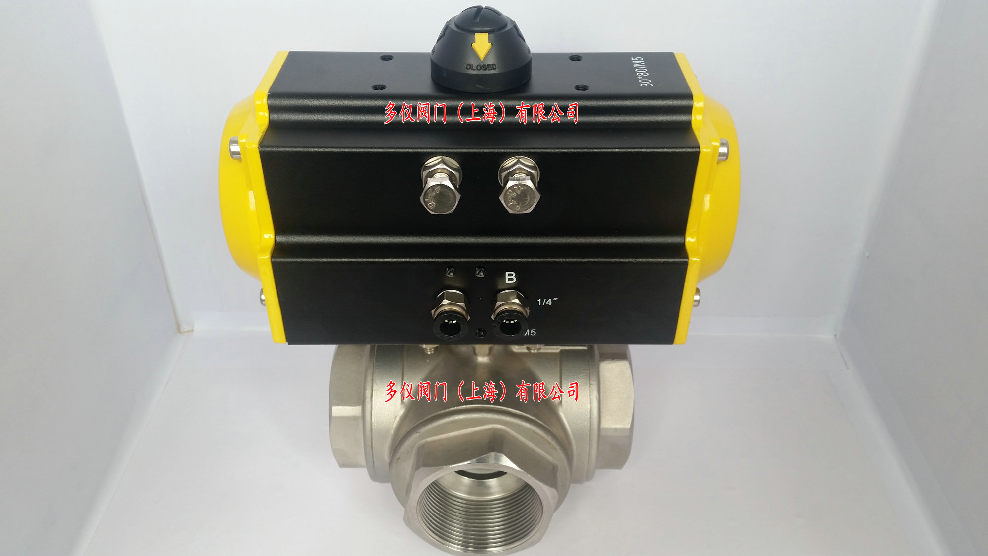 内螺纹气动三通球阀具有一阀多用的特点,任一通口可用作入口而无泄漏,三通既可制成L型通口,也可制成T型通口。且密封性能好,通常采用四面阀座材料聚四氟乙烯弹性变形实现无泄漏密封。装配上阀门定位器,还可以根据相关信号,调节阀门的开度大小,达到对管道介质的流量控制。